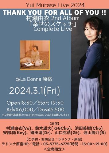 久しぶりの村瀬由衣ちゃんのライブが、原宿ラドンナで3月1日開催ですので、彼女に電話出演していただきました。 今度のライブは、彼女の2枚目のオリジナルアルバム”幸せのスケッチ”コンプリートLIVE!そして、今回のために書き下ろした新曲も幾つか用意し…